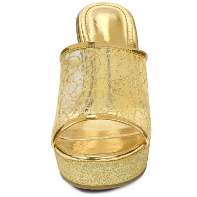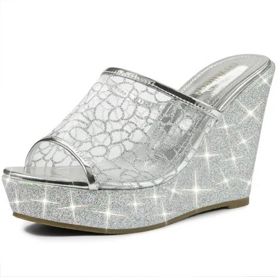 - Slide Wedges, Platform Wedge Sandals , Slip on, Glitter Mules, Mesh Upper