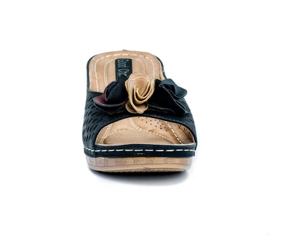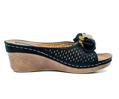 Inspire your look with these wedges from GC Shoes. The Juliet sandal is layered with feminine details, from the ruffled floral applique to the peep toe silhouette. The laser cut outs with the colored floral upper details fits naturally over the foot and an extremely padded footbed with a deep heel cup supports you while distributing the weight of each stride!