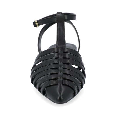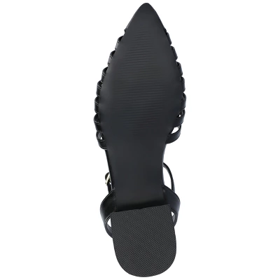 Our Alivia flats from Journee Collection will have you going out in all the style you could ever dream of, from a pair of flats. With its luxe vegan leather, pointed toe, T-strap design, and buckled ankle strap, this design offers style with comfort. A low-block heel and caged details elevate the look.