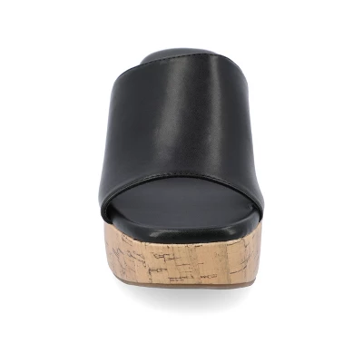 The Astter platform sandal from Journee Collection has a beautiful luxe vegan leather, faux cork outsole, single band design, and open round toe that will leave your feet looking the most stylish they have ever been. Their 4 mm Tru Comfort Foam™ insole will have you walking on a cloud with every step. Their slip-on closure makes them an easy grab-and-go shoe for any need.