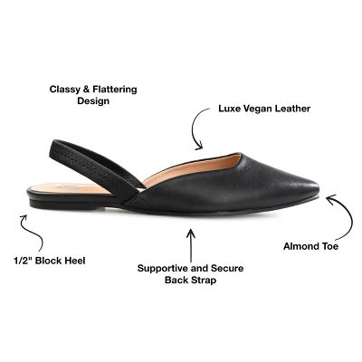 This slingback is a total throwback from the 90s, the Mallorca by Journee Collection. This effortless flat features vegan leather with a deep V detail at the topline. With an almond-toe silhouette and a super-soft padded footbed, you’ll find yourself wearing them with everything. At Journee Collection, our flat styles will have you looking just as professional as the boss at work to having the cutest shoes when you go out for the night.