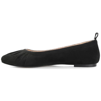 Darling details define the Tannya flat by Journee Collection. These versatile ballet flats feature vegan leather materials sitting on a 4 mm Tru Comfort Foam� insole for extra comfortable wear. Classic round toes and a contemporary ruched design at the top finish this eye-catching style that looks great dressed up or down. At Journee Collection our flat styles will have you looking just as professional as the boss at work to having the cutest shoes when you go out for the night.