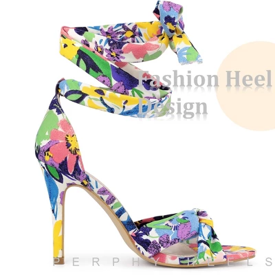 - [ FEATURES ]: Open toe; front twist; stiletto heels; lace up closure; summer floral printed design; lightly padded; classic high heeled sandals