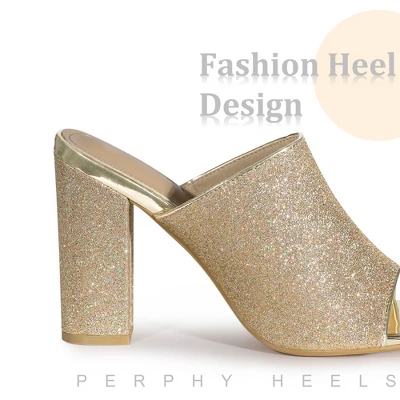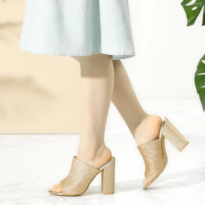- Open Toe; Slip-on; Glitter; Chunky High Heels; Block Heels; Mules Sandals